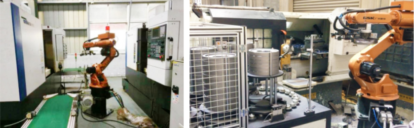 *The automatic production line consists of 1 robot for two lathes, one robot for 2 machining centers for loading and unloading, 2 robots transfer workpieces through conveying belts;